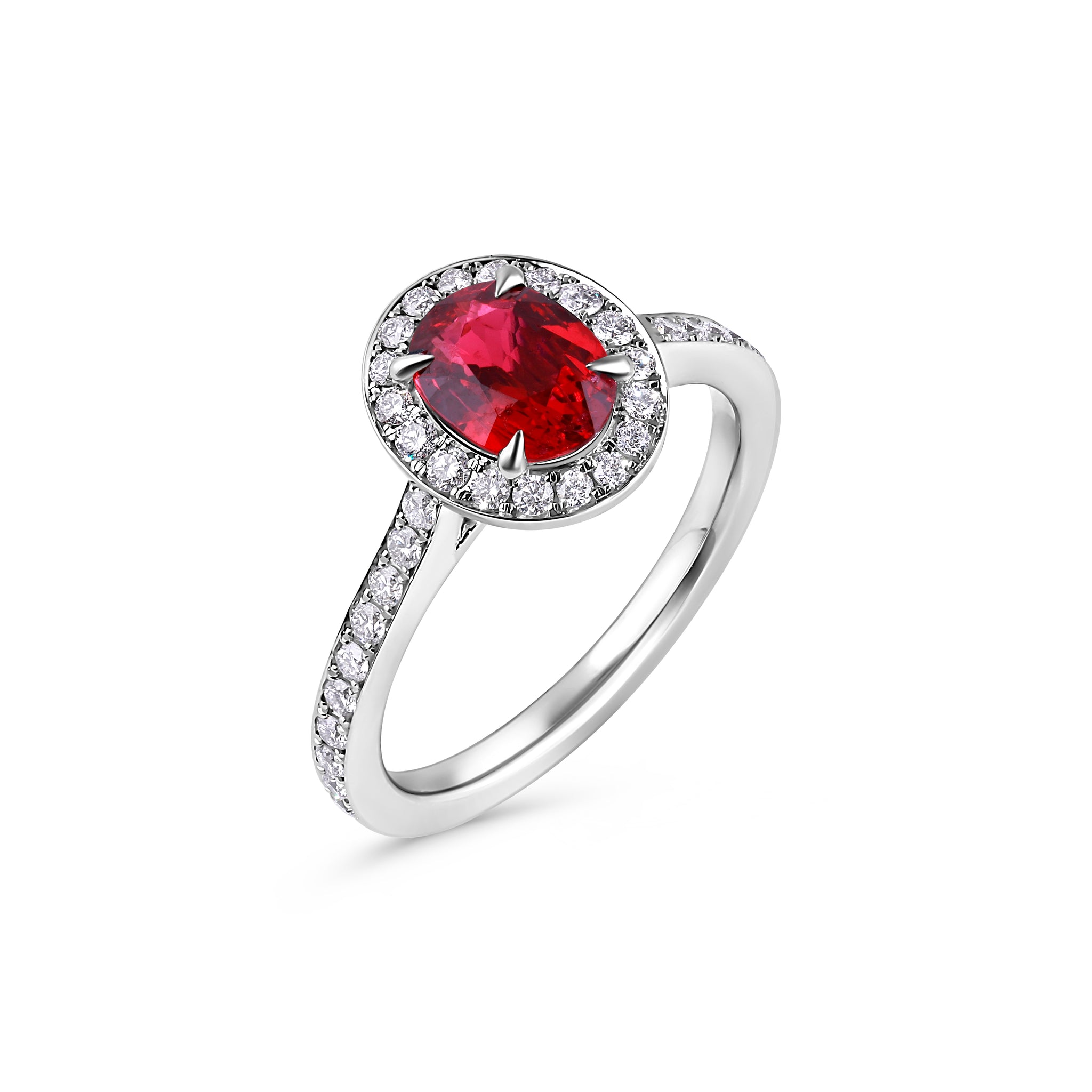 5.72 Grams, Platinum Custom Designed Ladies Ring Center 1.15ct Red Oval Brilliant Cut Spinel With 38 Pave Set Round Brilliant Diamonds Totaling 0.41ct Of F Color, VS1 Clarity
