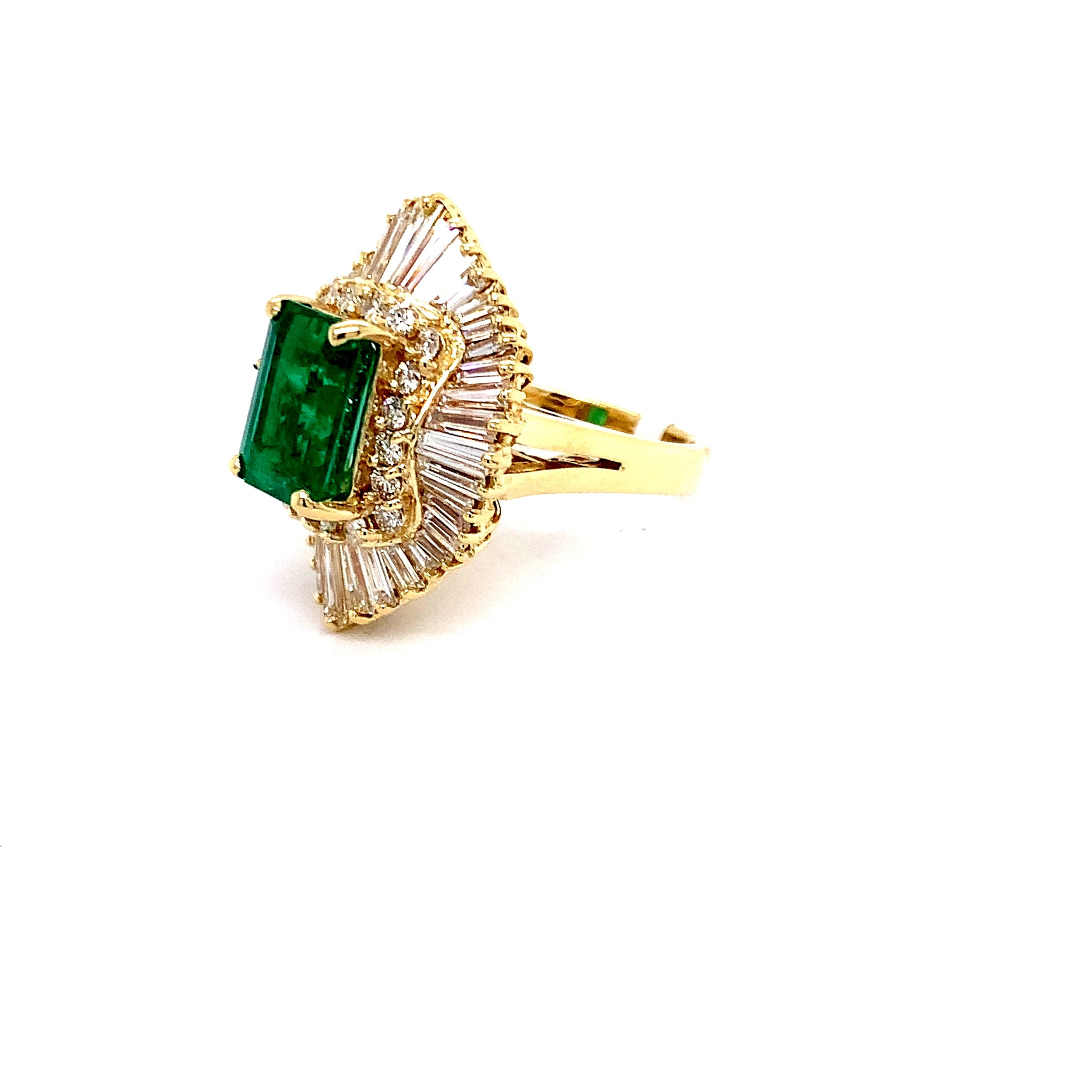 14K Yellow Gold Ring with 0.50ct Round Brilliant Diamonds of SI1 Clarity, G Color & 2.11ct Baguette Diamonds of VS Clarity, H Color Totaling 2.61ct Diamonds & 3.36ct Colombian Emerald dimension (10.40mm * 7.55mm)