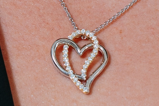-18K Yellow Gold & Platinum Double Heart Pendant With 28 Round Brilliant Diamonds Totaling 0.49ct Of F Color, VS1 Clarity